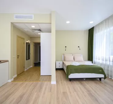Кровать 2-х спальная, диван, шкаф, стол, тумба прикроватная, телевизор, холодильник, кондиционер, сейф, фен, набор посуды на две персоны.