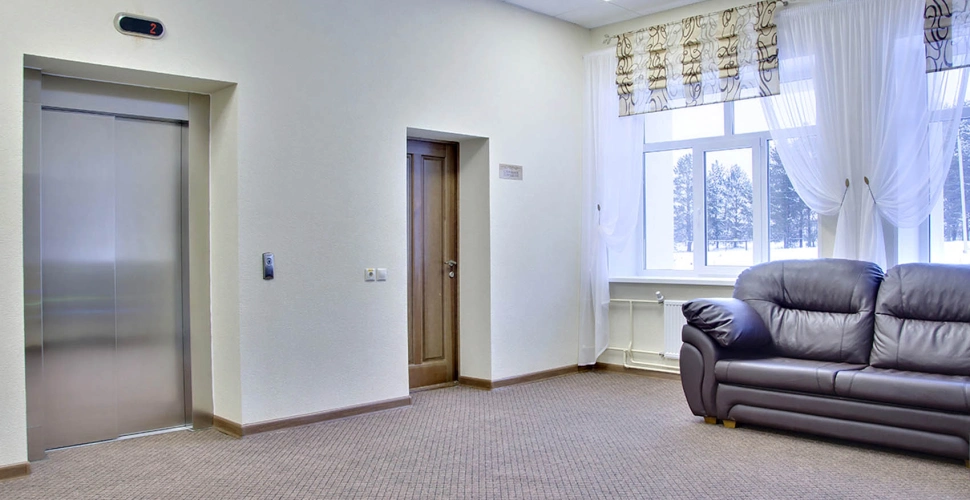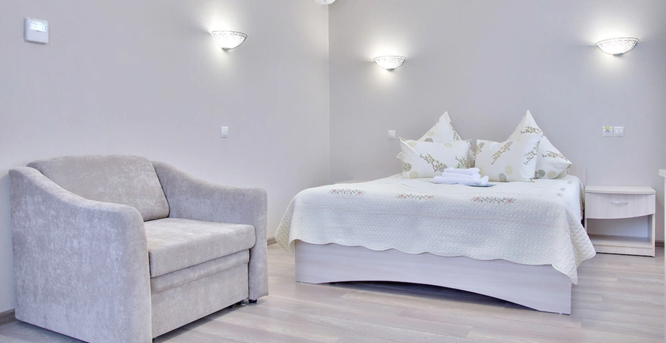 Кровать 2-х спальная, диван, комод, стол журнальный, тумба прикроватная, телевизор, холодильник, кондиционер, телефон, сейф, фен, набор посуды на две персоны. (17 м2)