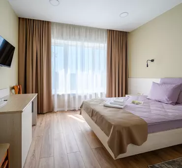Кровать, прикроватная тумбочка, шкаф, стол, зеркало, стул, телевизор, холодильник, кондиционер, фен.