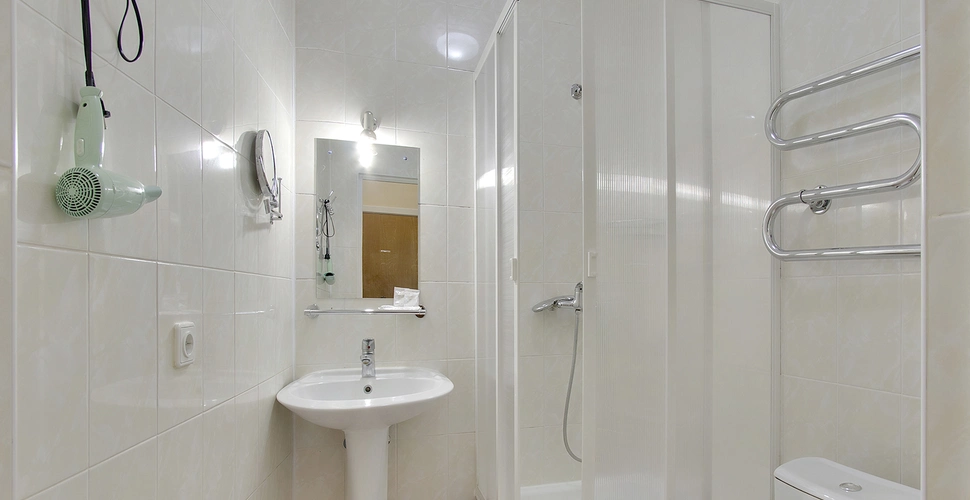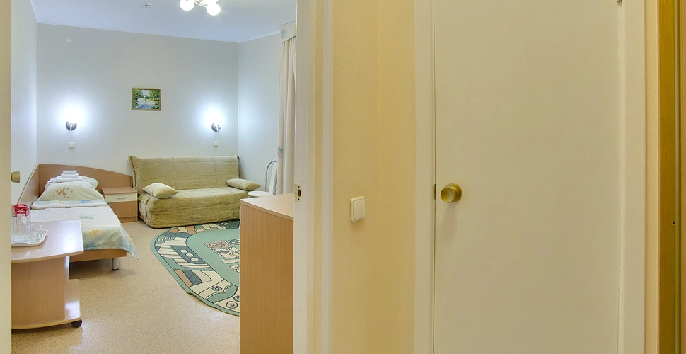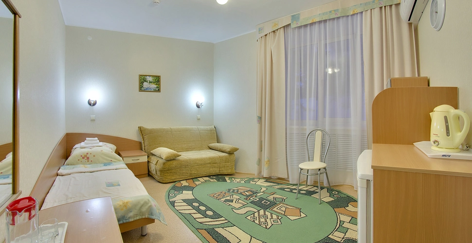 Кровать, диван, стенка ТВ, стол журнальный, тумбочка прикроватная, телевизор, холодильник, кондиционер, набор посуды на две персоны, фен, чайник электрический. (12кв.м)